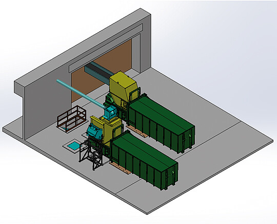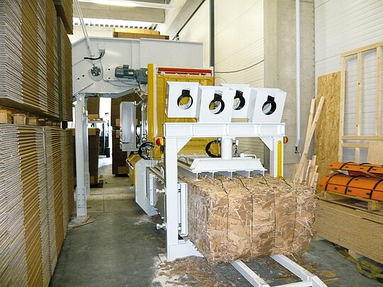 Projektbeschreibung: Die im 3-Schicht-Betrieb anfallenden Kartonage-Stanzreste fallen auf den Boden. Diese Reste sollen automatisch zu vermarktungsfähigen Ballen verpresst werden. Materialaufkommen zwischen 500 – 1000 kg/h.