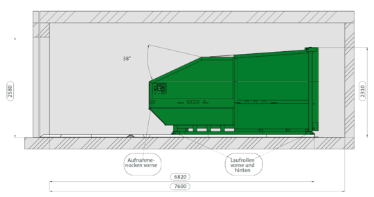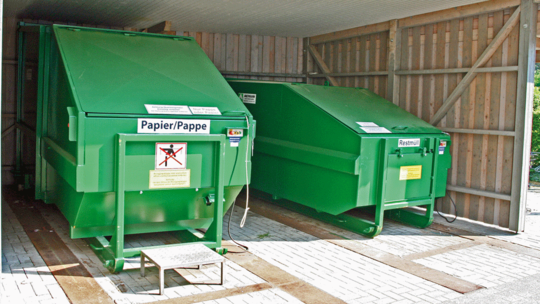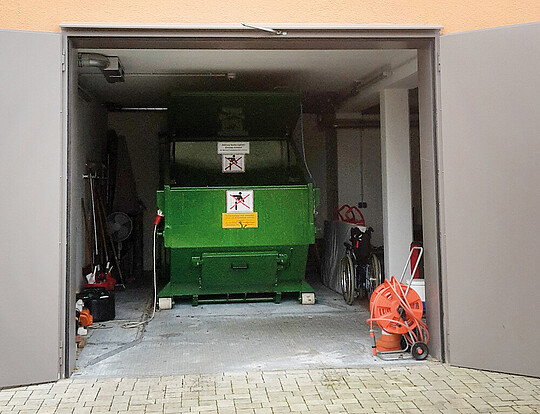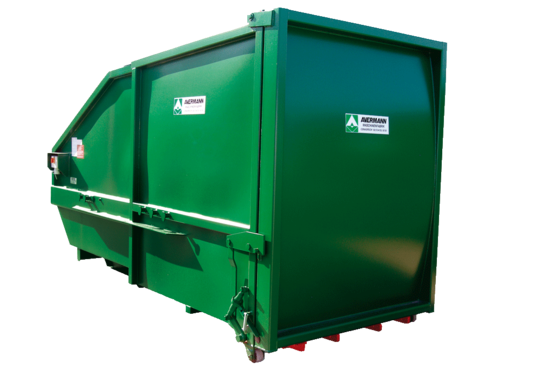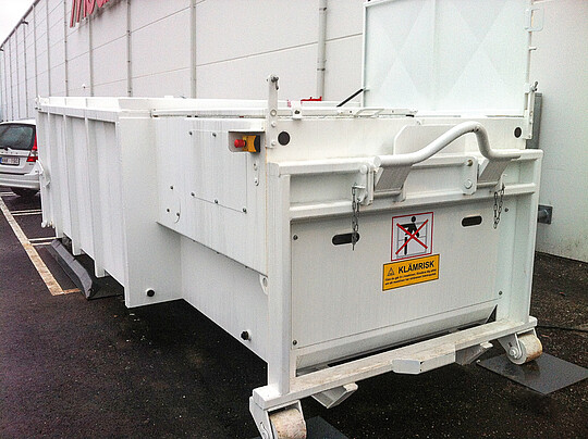 Für diesen Anwendungsfall haben die Avermann-Konstrukteure einen Presscontainer entwickelt, der auch in sehr beengten räumlichen Verhältnissen untergebracht werden kann. Mit einer Gesamthöhe von nur 2.310 mm passt dieser Container „in die kleinste Hütte“. Zum leichten Rangieren wurde der mobile 10m3 Presscontainer sowohl vorne als auch hinten mit Laufrollen ausgestattet. Mit zusätzlichen Aufnahmenocken vorne kann der Presscontainer – wenn er auf dem Boden steht – bewegt werden. Die exakte Positionierung erfolgt über Zentrierschienen, die auf dem Boden verdübelt sind. Unauffällig und zuverlässig verrichtet dieser Presscontainer seinen Dienst.